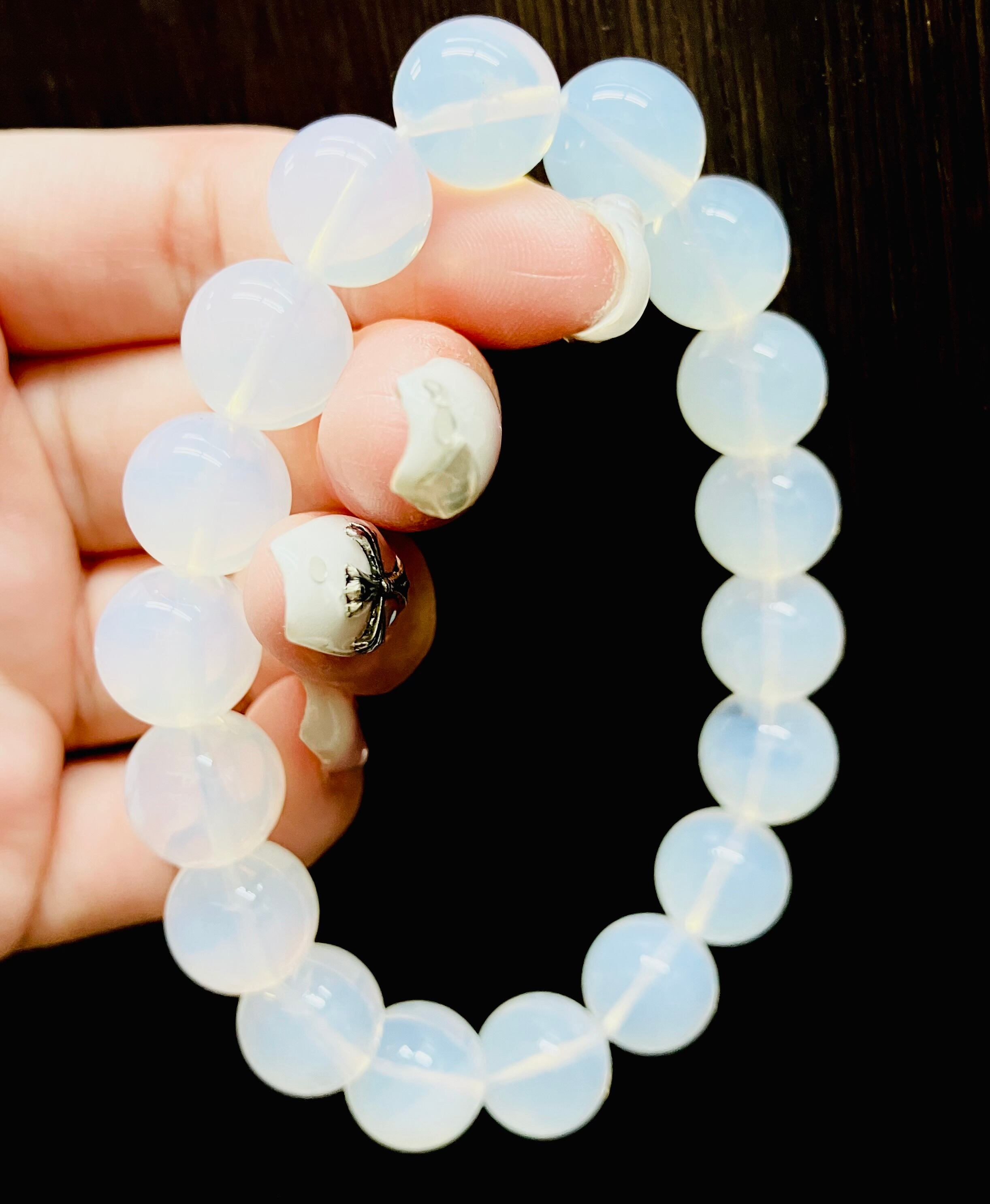 この石は、本来この様な乳白色が美しい不透明な石ですが、様々な加工により黒や金などに変色することからこの様に名付けられました。